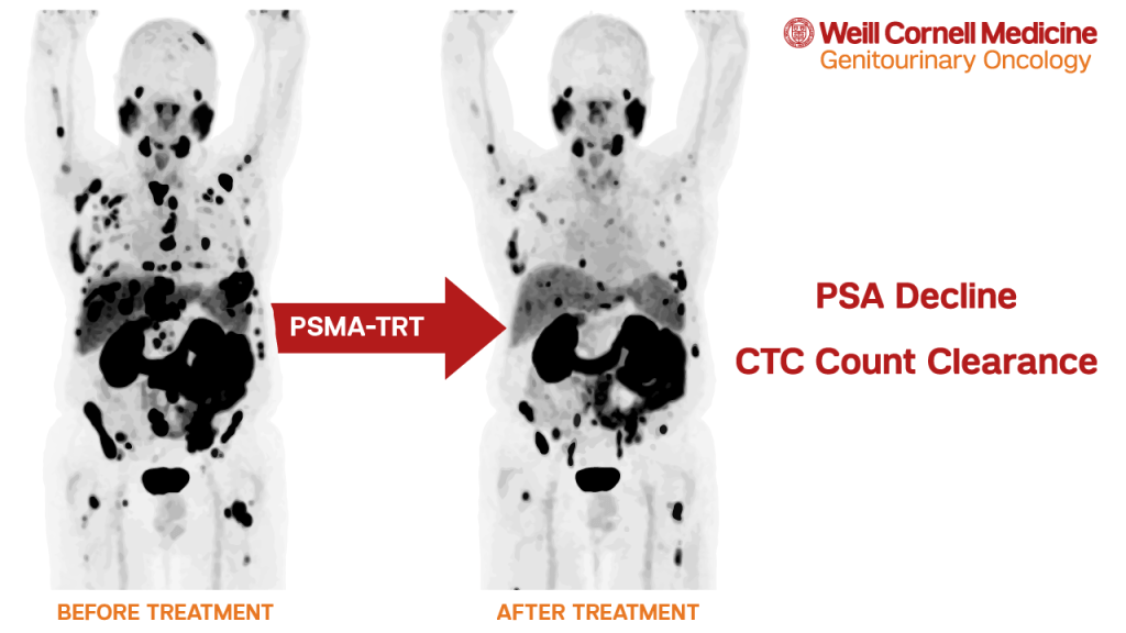 Weill Cornell researchers examined several sequential prospective clinical trials utilizing various PSMA-TRT agents. In an analysis of 116 patients, 70% treated with PSMA-TRT and with CTC counts before and after therapy had a decline in CTC counts. Some PSMA-targeting agents (i.e. the carrier molecules) may have anti-cancer effects on their own. While it appears that agents labeled with radioactive particles are more effective, some patients treated with anti-PSMA antibody J591 alone had control of CTC counts.