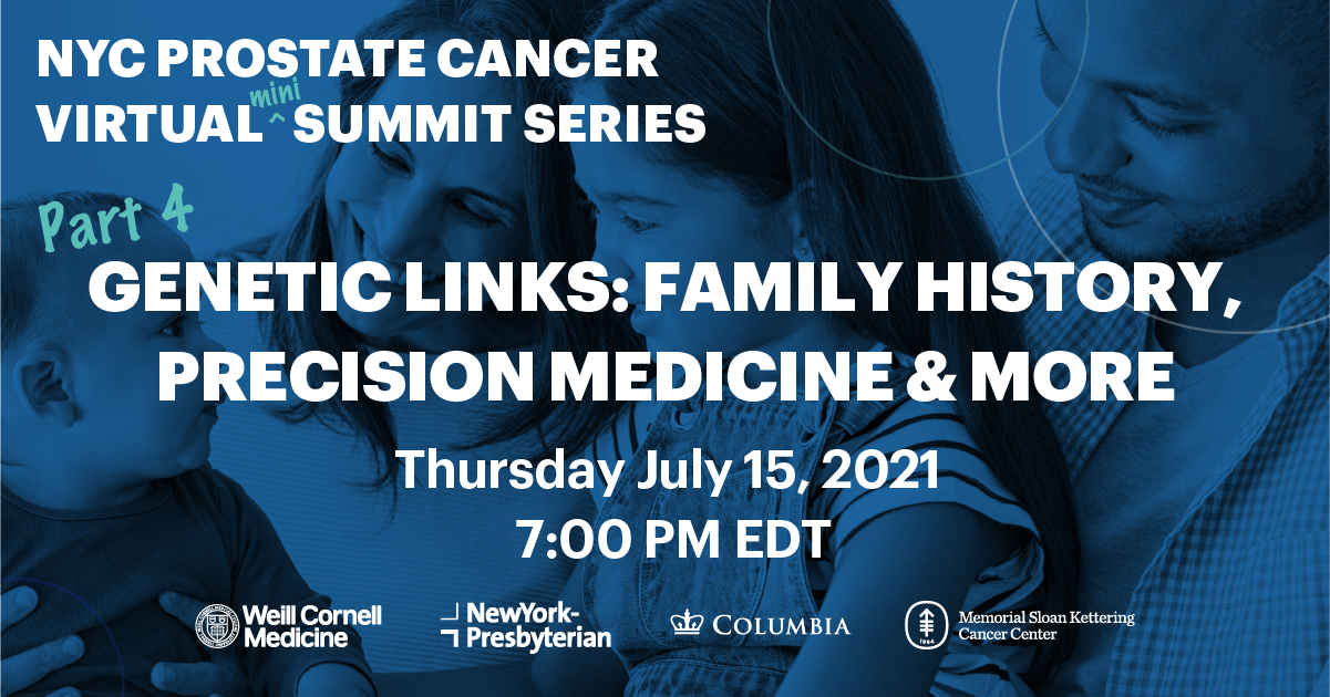 Mark your calendar and sign up for Part 4 – Genetic Links: Family History, Precision Medicine & More on Thursday, July 15th at 7PM ET. Precision medicine is changing the way physicians approach prostate cancer care, using information about the prostate cancer genetics and a patient’s inherited genetic makeup to develop individualized treatment plans. Cutting-edge research advances in prostate cancer biology are shaping treatment breakthroughs and guiding the development of new therapeutics and clinical trials. All prostate cancer patients and family members are welcome.